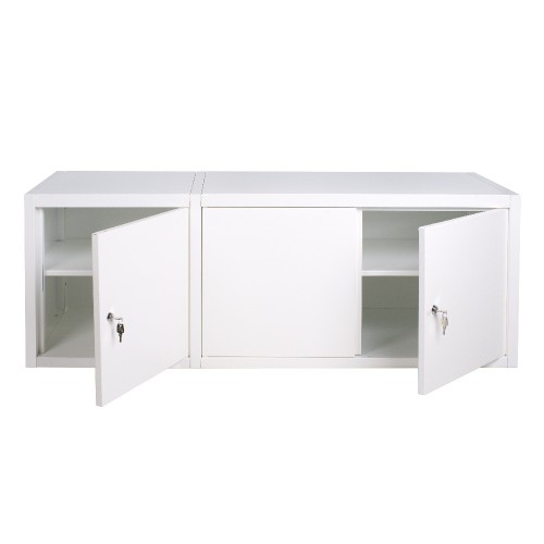 2 отделения, 3 распашных дверки, полка в каждом отделении, 2 замка