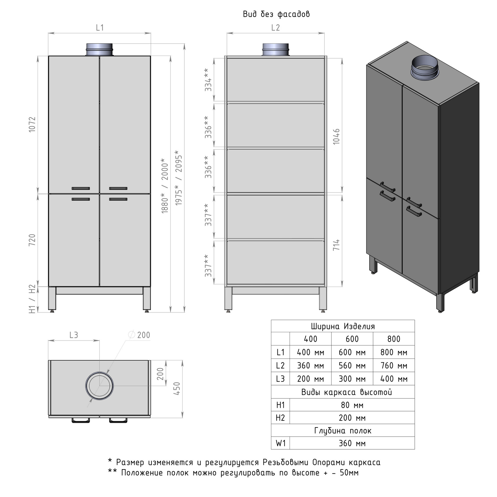 Для компенсации неровностей пола в каркасе предусмотрены регулируемые опоры (0-30 мм).