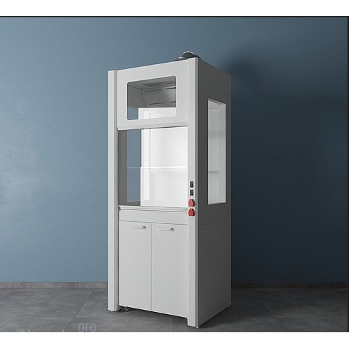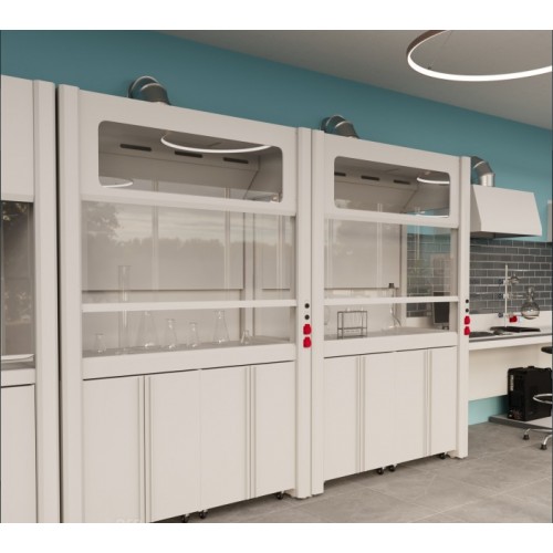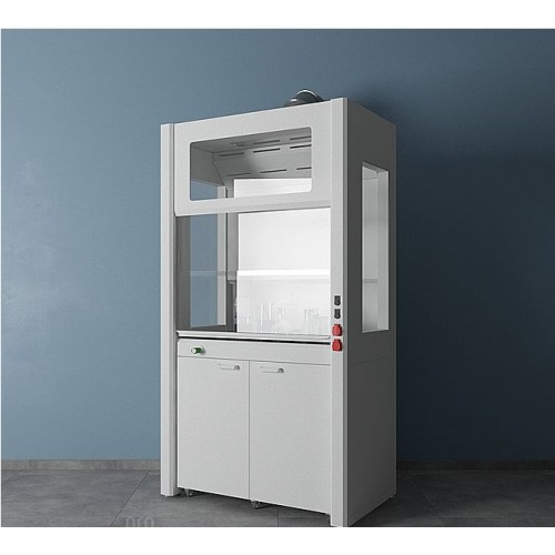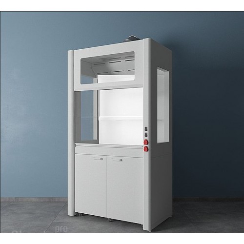 Вытяжная камера шкафа (верхняя часть) изготовлена из стали с полимерным покрытием. Рабочая камера имеет три зоны вытяжки - сверху, посередине и снизу рабочего объёма. Нижняя часть - прочный металлический каркас с полимерным покрытием серого цвета. В каркасе предусмотрены регулируемые опоры в диапазоне 0-30 мм для компенсации неровностей поверхности.