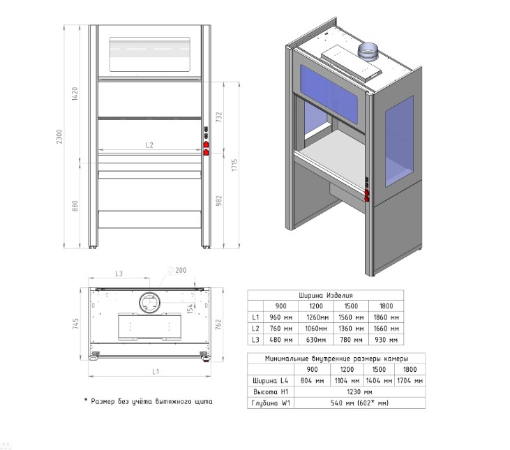 1. Вытяжная камера из листовой стали с полимерным покрытием, вставки в корпус из оргстекла;