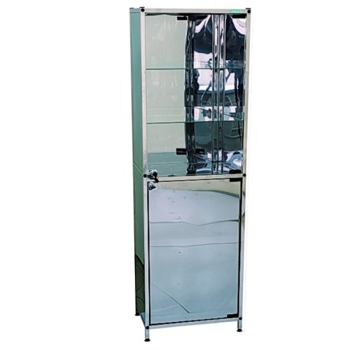 Имеет два отделения: верхнее укомплектовано стеклянными полками и дверцей, нижнее - полки и дверца из нержавеющей стали, дверцы укомплектованы замками. Установлен на винтовые, регулируемые опоры.