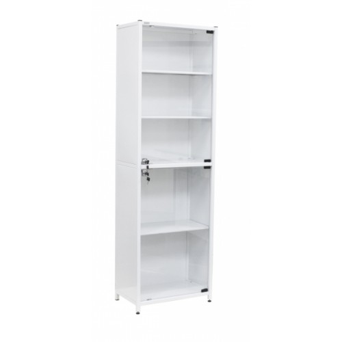 Шкаф имеет два отделения, каждое из которых имеет стеклянную дверь с замком, в верхнем две металлические полки, в нижнем одна.