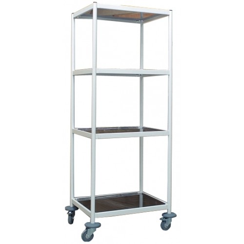 Каркас изготовлен из стального профиля окрашенного экологически чистой эпоксидной полимерно-порошковой краской. Установлен на поворотные колесные опоры диаметром 75 мм, две из которых с тормозом. Колесные опоры самоорентируещиеся из немаркой серой резины. Четыре съемные полки - из нержавеющей листовой стали толщиной 0,8 мм. Стеллаж имеет разборную конструкцию, может поставляться в разобранном виде.