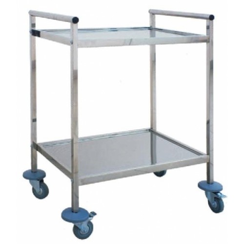 Каркас изготовлен из нержавеющего тонкостенного профиля.Поверхность стола - глянцевая. Установлен на поворотные самоориентирующиеся колеса - 75 мм. Конструкция стола разборная.