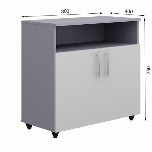 Шкаф низкий с дверцами и открытой полкой используется в общественных помещениях различного назначения, для оснащения рабочих мест. Изделие предназначено для хранения канцелярских принадлежностей, документов, сочетает в себе рациональность конструкции и надежность эксплуатации. Шкаф установлен на регулируемые опоры высотой 50 мм. Расстояние между полками: 200 мм.