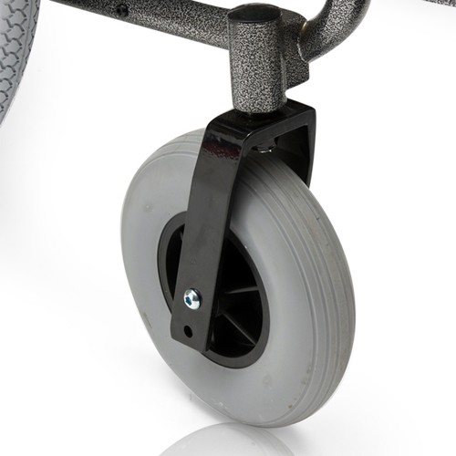 Кресло-коляска оснащена колесами, имеющими пневматические задние и передние цельнолитые шины.